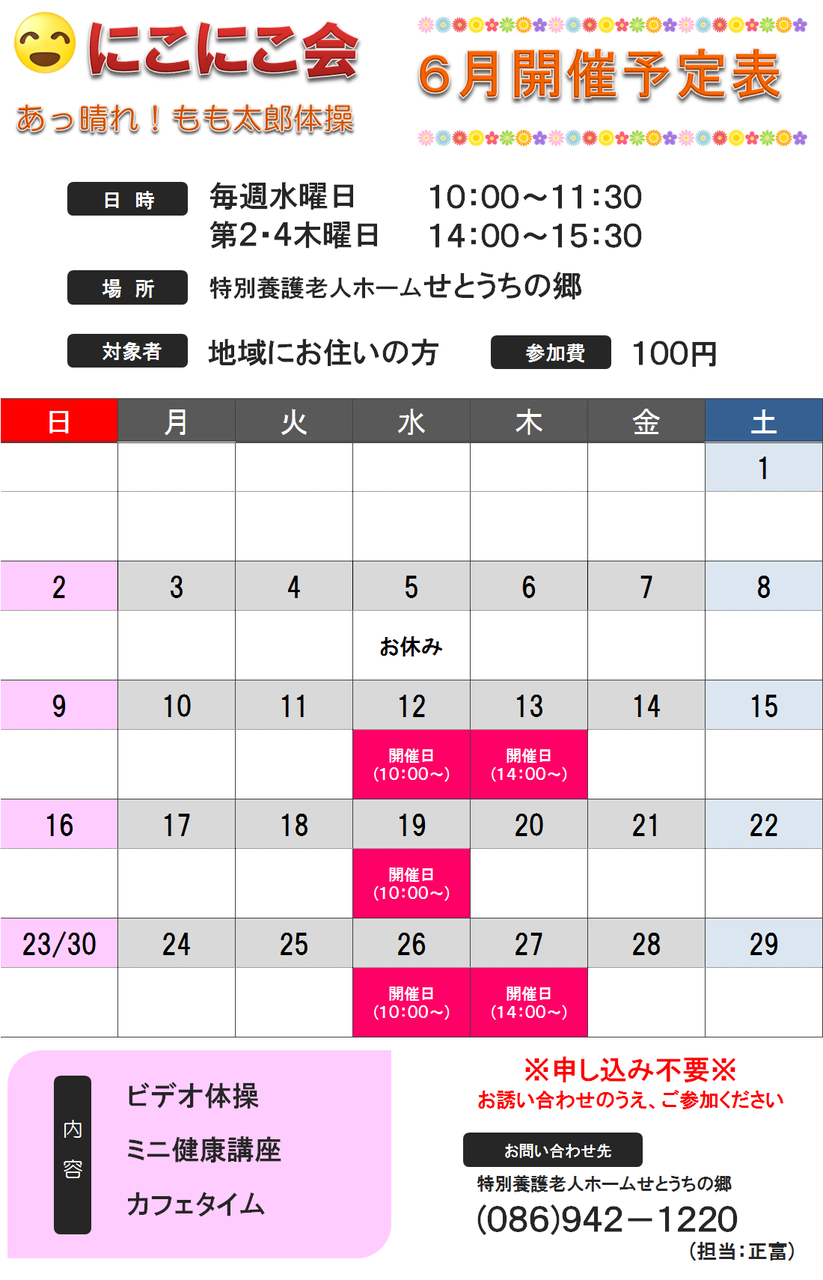 2019年06月12日 活動報告地域共生 にこにこ会 6月予定表(せとうちの郷) にこにこ会では、あっ晴れ!もも太郎体操(ビデオ体操)やミニ健康講座等、心も身体も元気に楽しく過ごせるよう開催していますお誘いあわせの上、ぜひご参加ください 日時:毎週水曜日 10時~11時半 第2.4木曜日 14時~15時半※6月5日(水)はお休みです。 場所:特別養護老人ホーム『せとうちの郷』 対象者:地域にお住いの方 参加費:100円 お問い合わせ先特別養護老人ホームせとうちの郷TEL:(086)942-1220 担当:正富 Shere