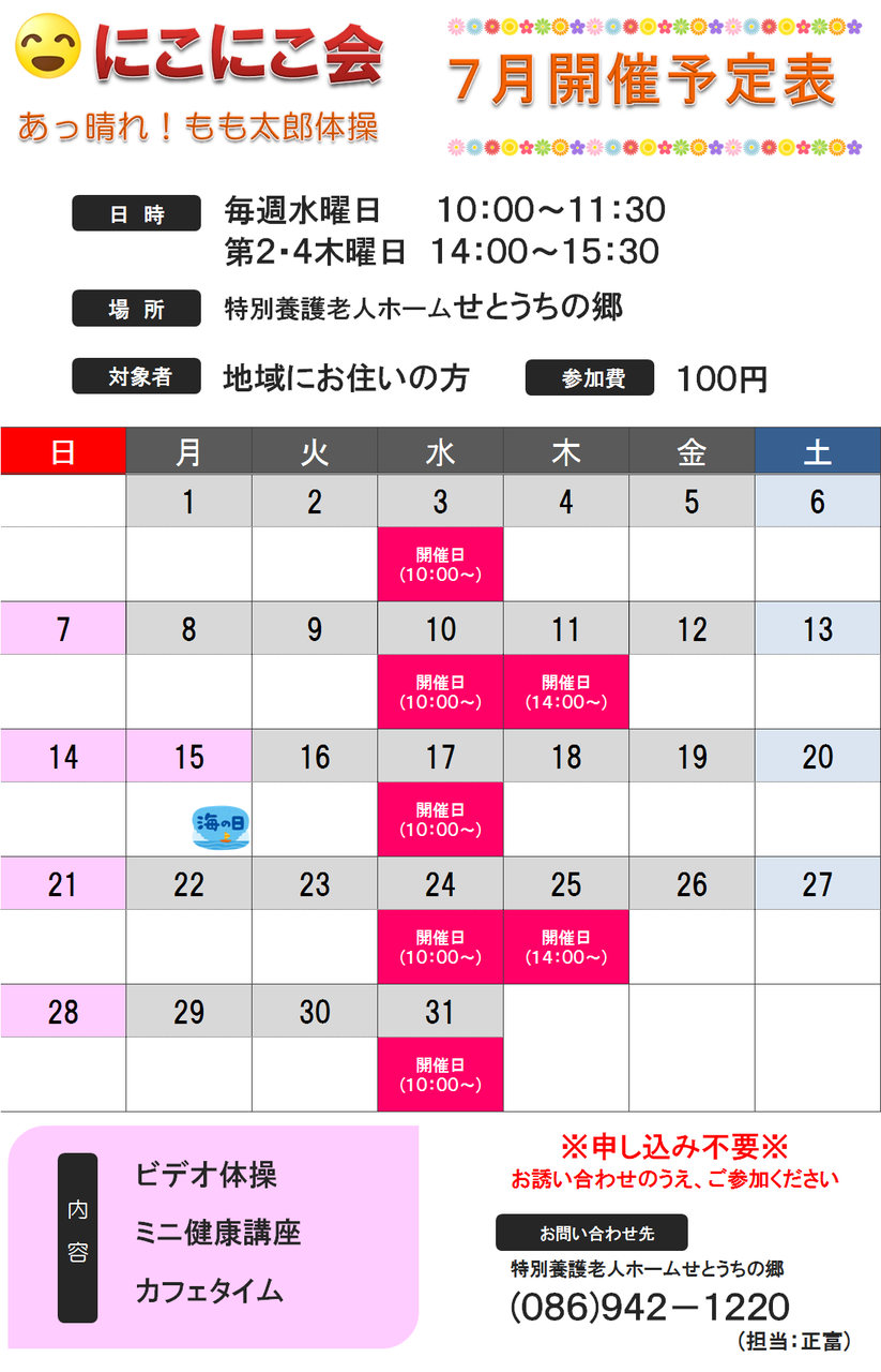 2019年06月19日 活動報告地域共生 にこにこ会7月開催予定のご案内(せとうちの郷) にこにこ会 7月開催予定のご案内です どなたでもご参加いただけます申込み不要ですので、お誘いわせのうえご参加ください Shere