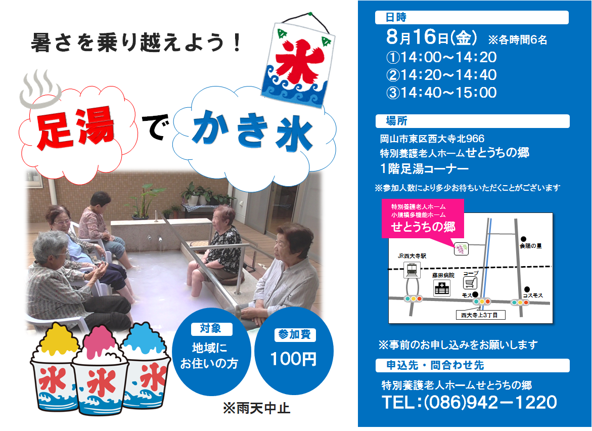 2019年08月07日 活動報告 せとうちの郷「足湯でかき氷」のご案内 せとうちの郷にて“足湯でかき氷”を開催予定です 日にち:8月16日(金)時間:①14:00~14:20 ②14:20~14:40 ③14:40~15:00※各時間6名まで 詳しくは下記をご覧ください 皆様のお越しをお待ちしています Shere