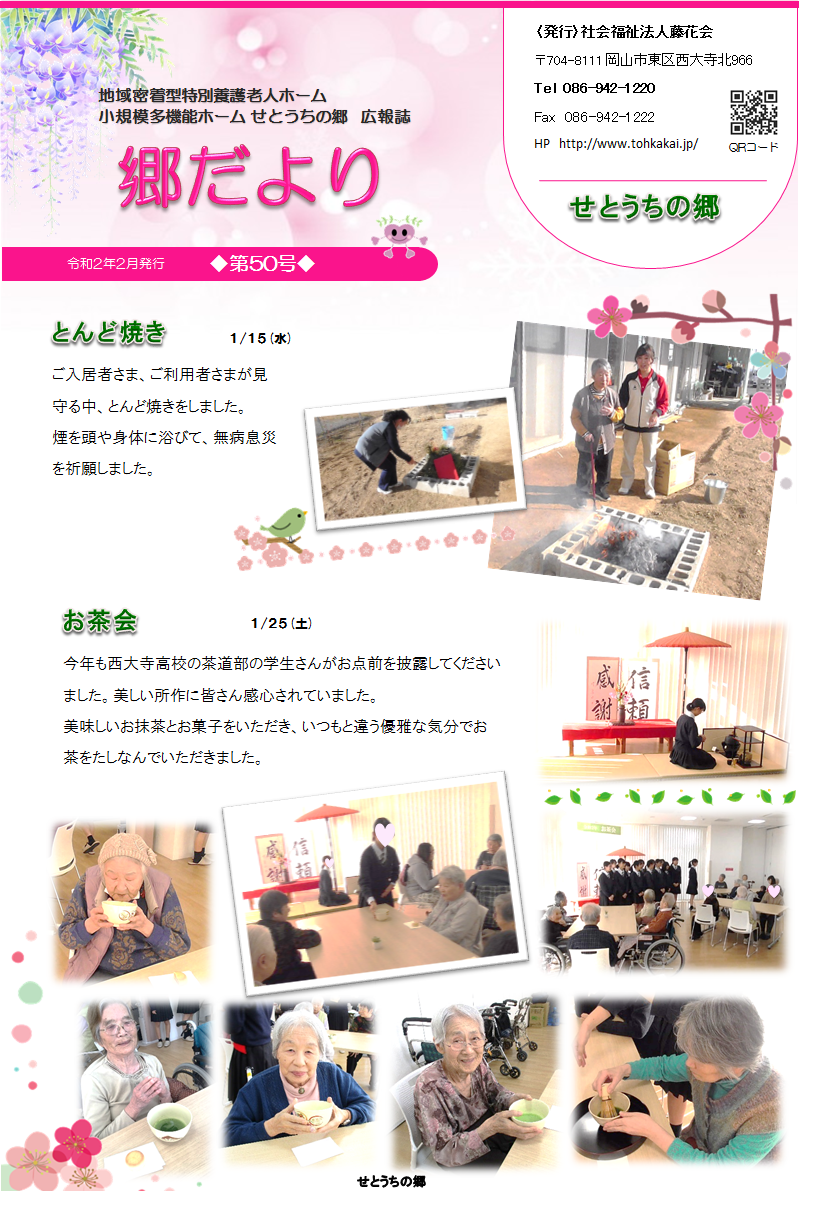 2020年02月10日 活動報告 せとうちの郷広報誌“郷だより”2月号発行!! せとうちの郷広報誌“郷だより”2月号を発行しました 1月の出来事や2月以降の行事等掲載しています ぜひご覧ください Shere