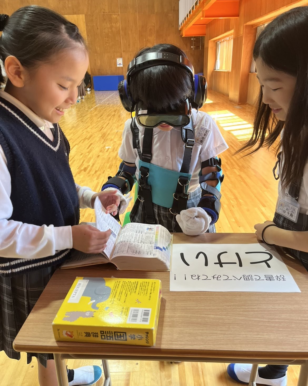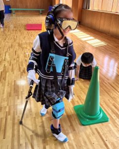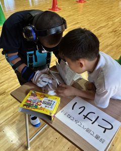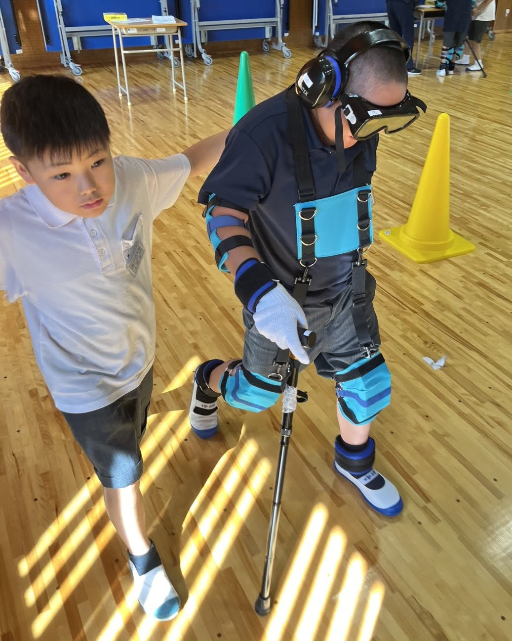 装具を装着した子どもたちは、見えにくさ、聞こえにくさ、手足の動かしづらさなどに戸惑いながらも、互いに声をかけ合い、支え合い、励まし合いながら真剣に取り組んでいました。
