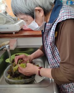 ご利用者様は「昔はようけ作りよったんよ」と懐かしそうに話されながら、慣れた手つきでレタスを収穫。