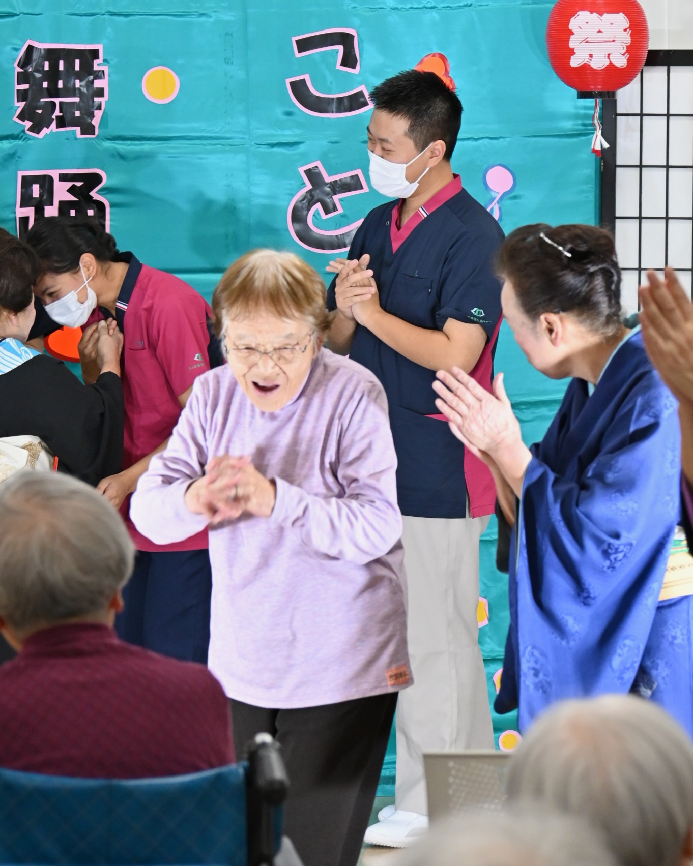 音楽が流れると、自然とご利用者様が立ち上がり、実習生も加わって、大きな踊りの輪ができました。