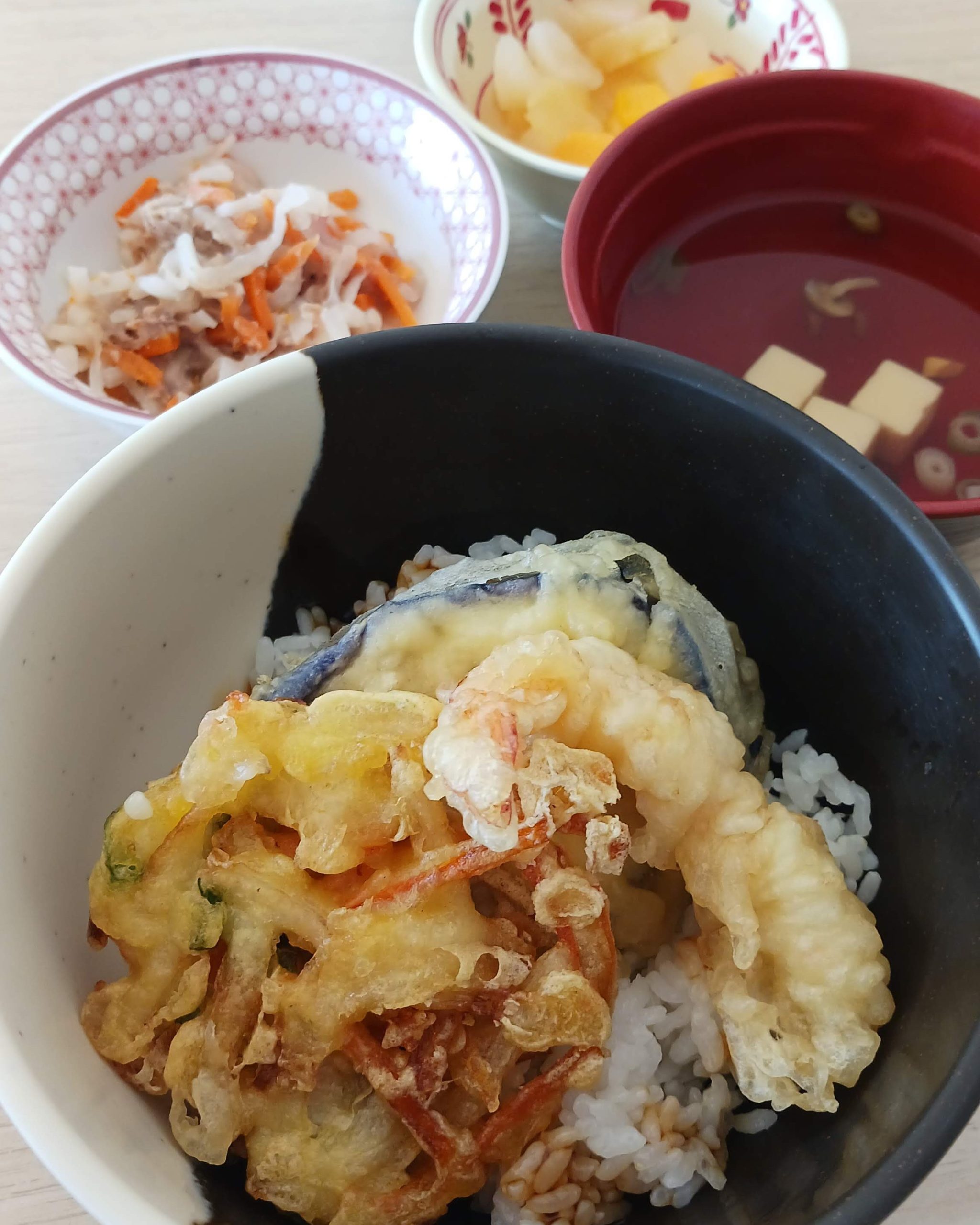 えびや野菜の天ぷらを熱々のご飯にのせて、甘じょっぱいタレをたっぷりとかけました。