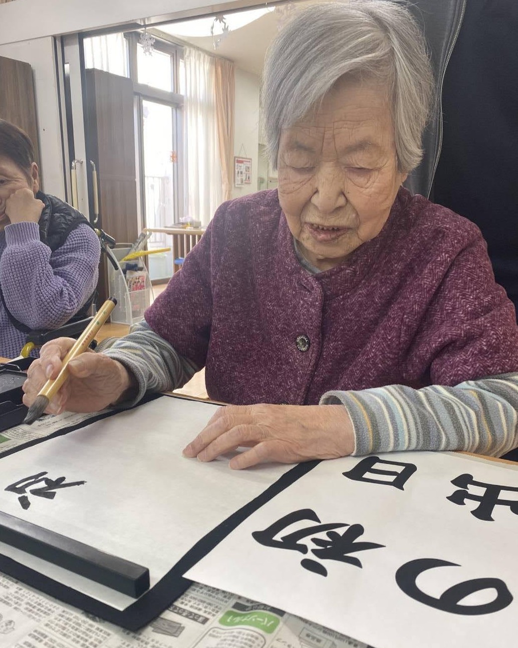 「賀正」の書初めを掲げる入居者様。特別養護老人ホームせとうちにて。 書初めをする入居者様。特別養護老人ホームせとうちにて。