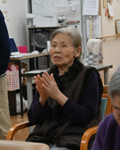 今月の介護予防ショートステイにて、早口言葉に挑戦するご利用者様。飲み込みや口腔体操の説明を受けるご利用者様の写真。特別養護老人ホームせとうちにて。 今月の介護予防ショートステイは「食べて元気を維持しよう」。飲み込みや口腔体操の説明を受けるご利用者様の写真。特別養護老人ホームせとうちにて。