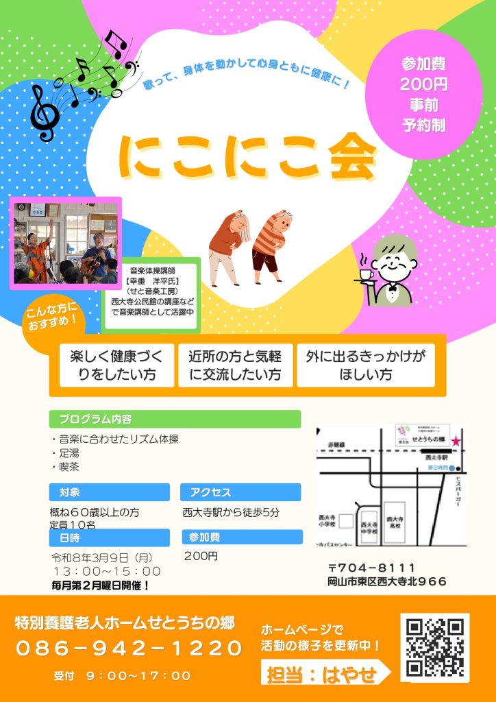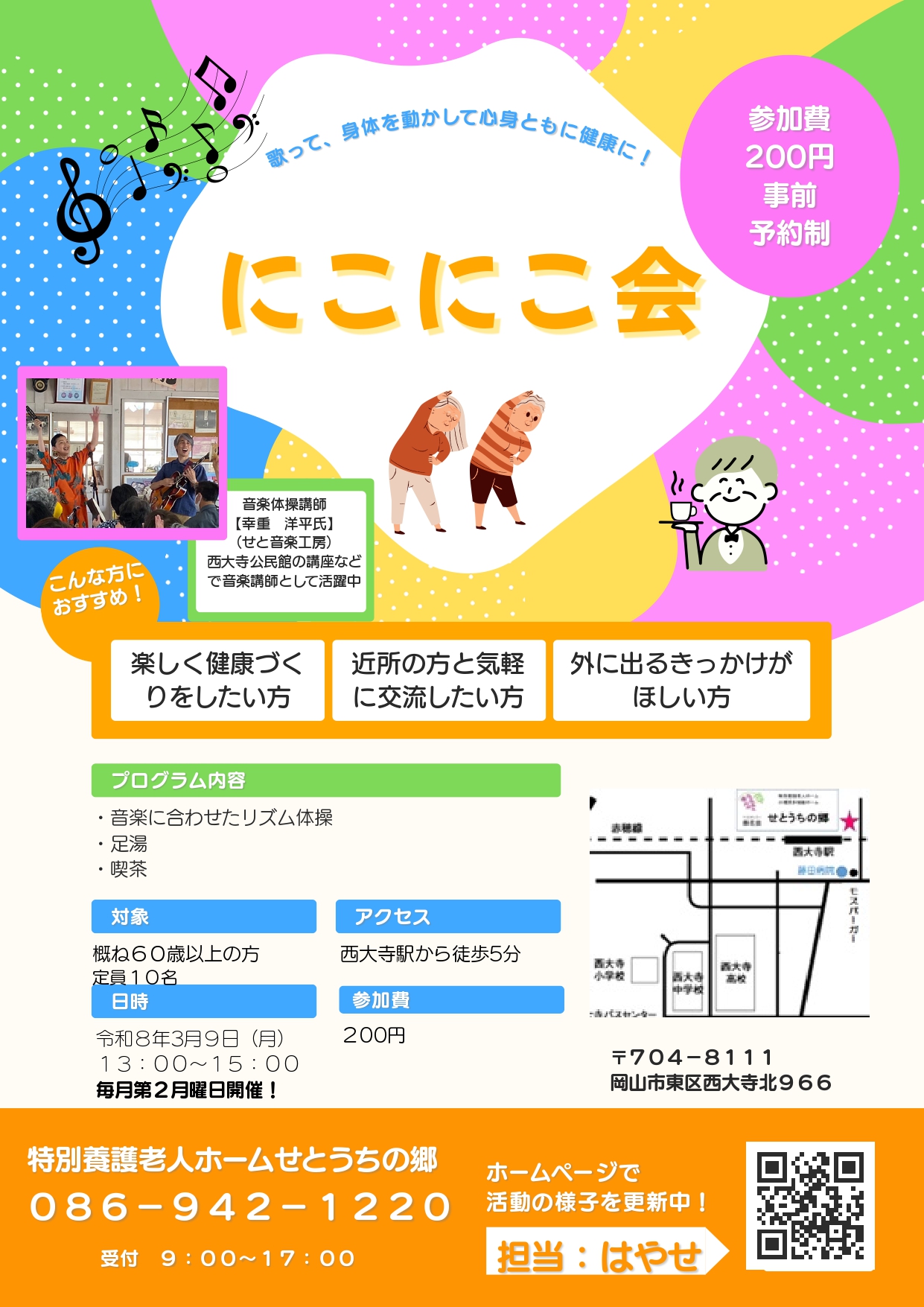 特別養護老人ホームせとうちの郷では、地域の皆さまと一緒に楽しく健康づくりができる交流の場「にこにこ会」を開催しています。